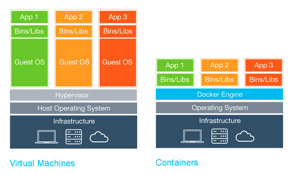 This is a great image which depicts the lightweight nature of a container vs a virtual machine. Containers can utilize the host OS which allows them to run much quicker and spin up in a fraction of the time of a virtual machine